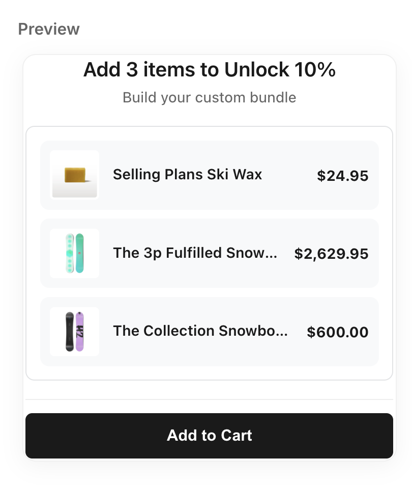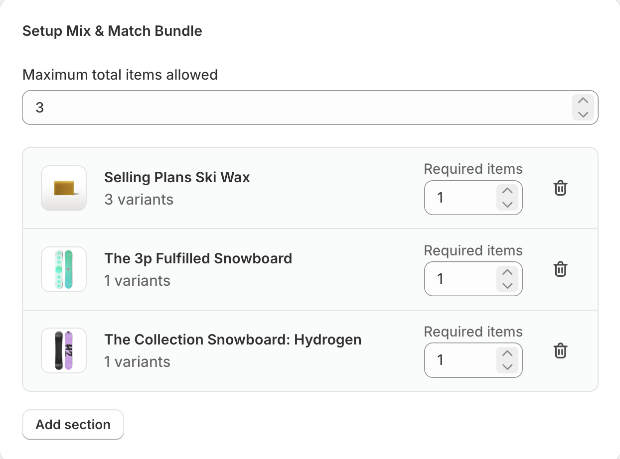 Mix & Match Bundles allow customers to build their own bundle by choosing products from specific sections. This is ideal for "Build Your Own Box" or custom kit offers.