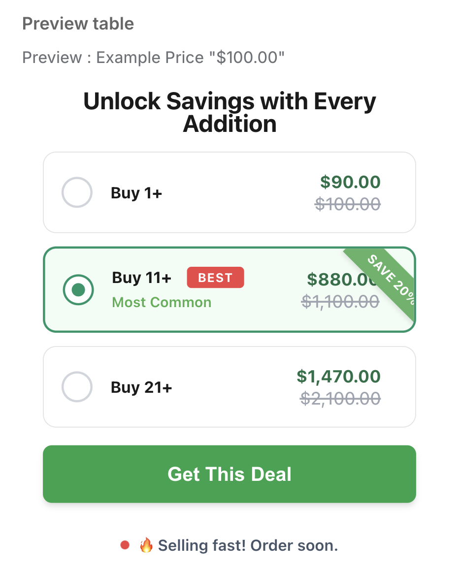 The Volume Radio widget displays quantity breaks as a list of selectable radio buttons. This layout is ideal for offering a clear, linear selection where customers can easily compare discount tiers and choose their preferred quantity with a single click.